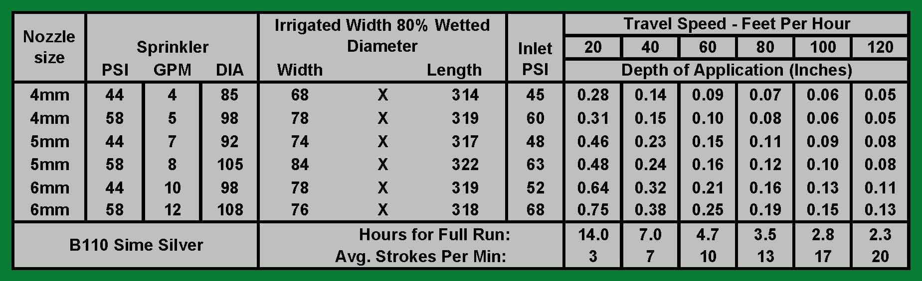 - Irrigated Area Per Run (Acres): 0.5 - 0.9